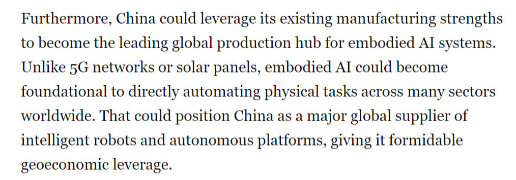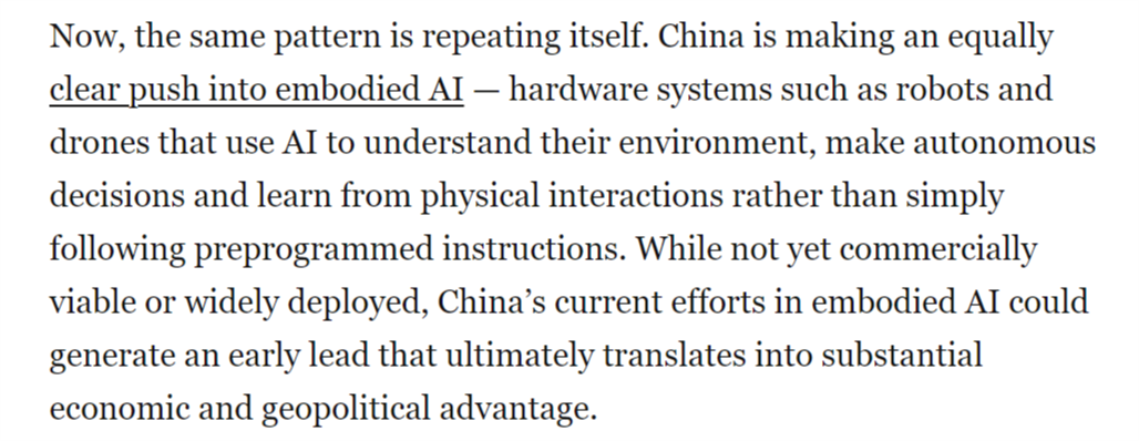但中国当前正在具身人工智能范畴的勤奋可能使其取得晚期领先,